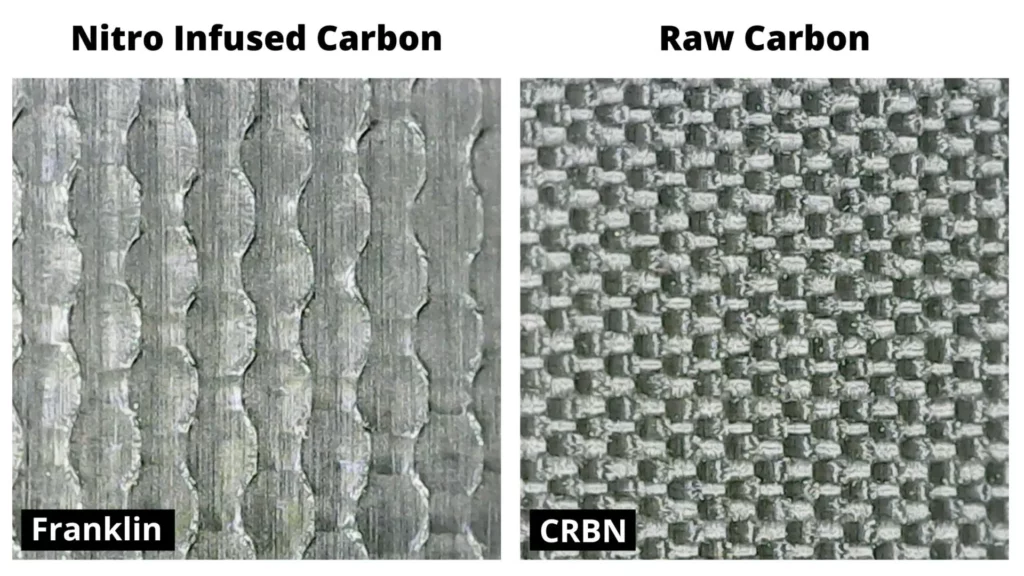 The other feature, Nitro Infused Carbon Fiber Surface, is different than anything else out there. Franklin advertises this face as a raw carbon face like a lot of other paddles but it doesn’t look or feel like all other raw carbon paddles to the touch. Here’s a close of the face material under a microscope comparing the Nitro Infused Carbon to a regular raw carbon face from CRBN.