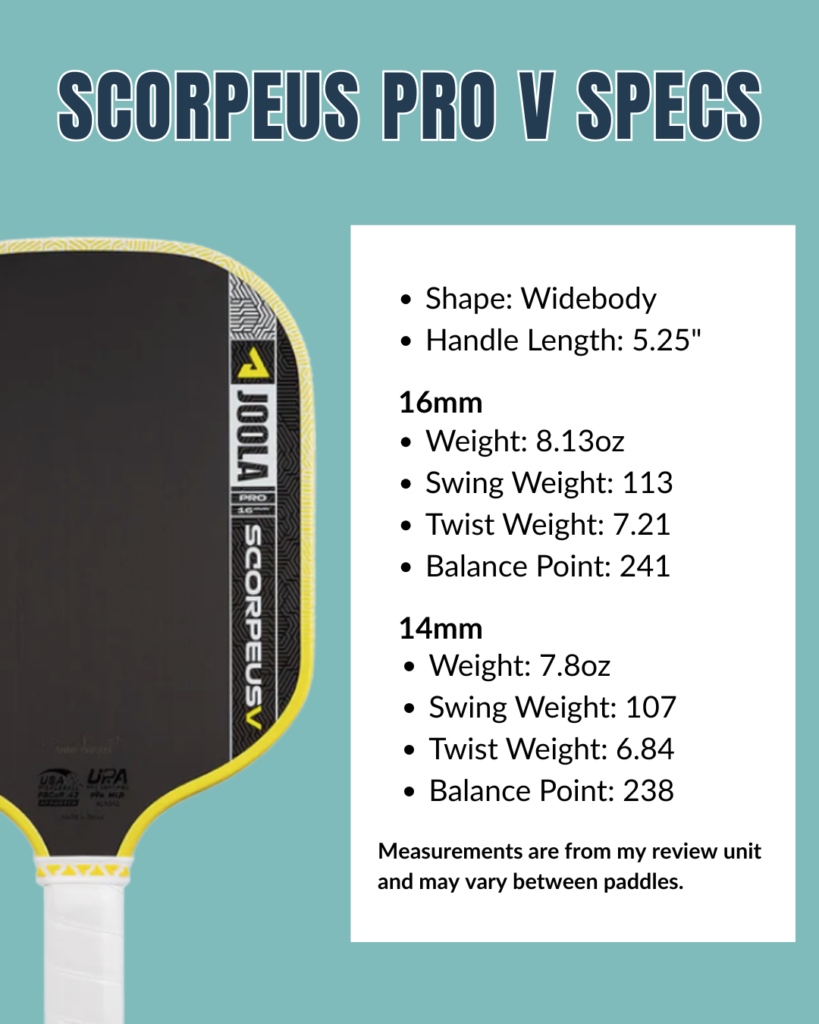 JOOLA is replacing the Magnus shape with a new hybrid model called the Kosmos, now used by pro Federico Staksrud. The Pro V line is available in multiple shape options, each offered in both 14mm and 16mm thicknesses. Below are the specifications for the models I was able to test and measure. I don’t have data on every version yet, but here’s what I have so far.