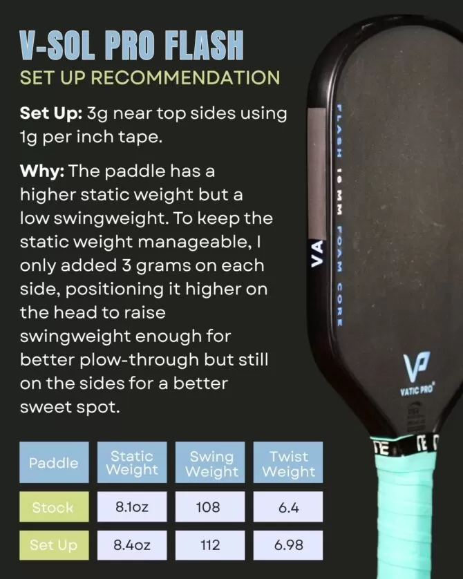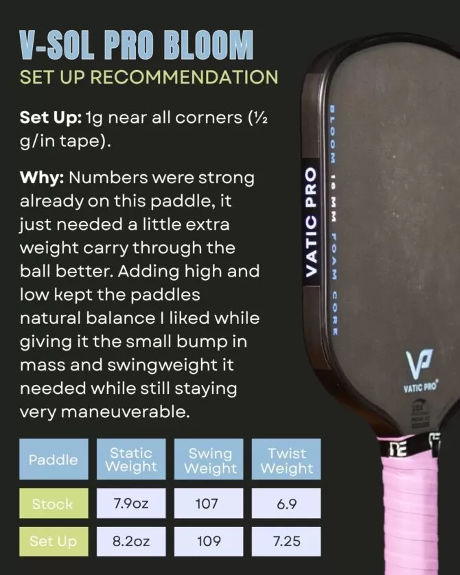 The Vatic Pro paddles don’t have to have weight added to play well but they do still benefit from it. I have a couple of recommended setups for them below. I’ll add more as I make them, sorry there are only a couple for now.