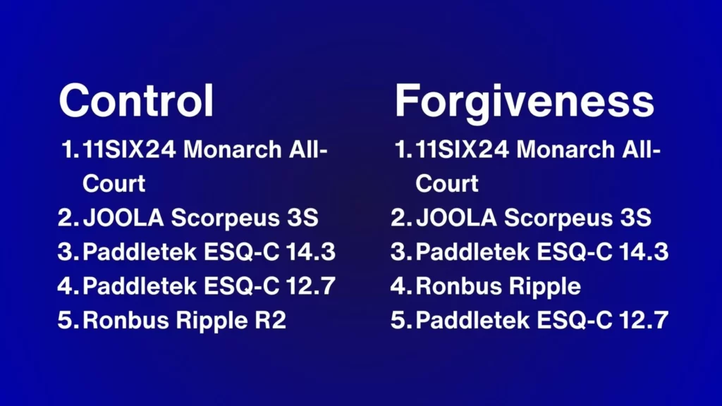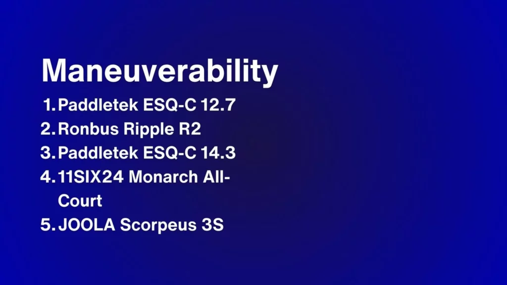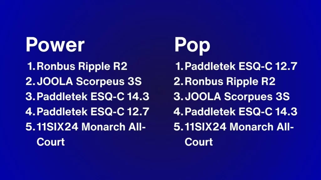 Now here are some rankings of power, pop, control, forgiveness, and maneuverability for other popular power and all-court paddles in the standard or widebody shape category. Included in the lists are the Paddletek ESQ-Cs, JOOLA Scorpeus 3S 16mm, Ronbus Ripple R2, and the 11SIX24 Monarch All-Court 16mm. If you decide to get any of these paddles, my code 10EFFECT works on all their sites.