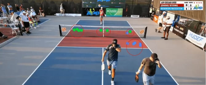 I’ve marked the spots where each dink was hit during the rally. First, notice the groupings or areas they were targeting their dinks.